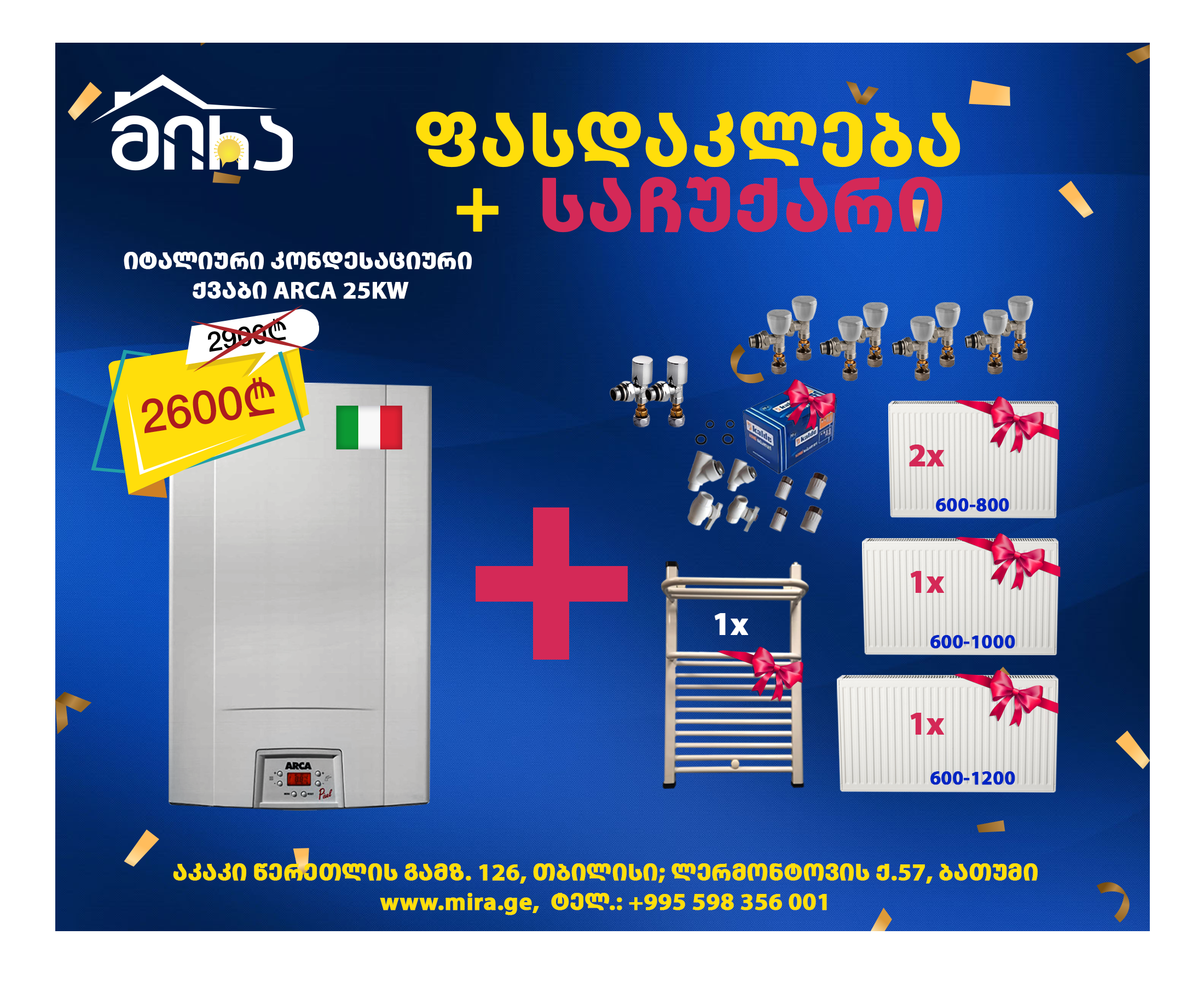 გრანდიოზული ფასდაკლება + საჩუქარი შეიძინეთ იტალიური კონდესაციური 25KW-იანი ქვაბი ARCA მირაში ფასდაკლებით 2900 ლარის ნაცვლად 2600 ლარად და მიიღეთ 1000 ლარამდე პროდუქცია საჩუქრად: